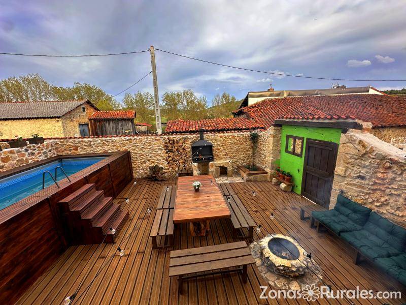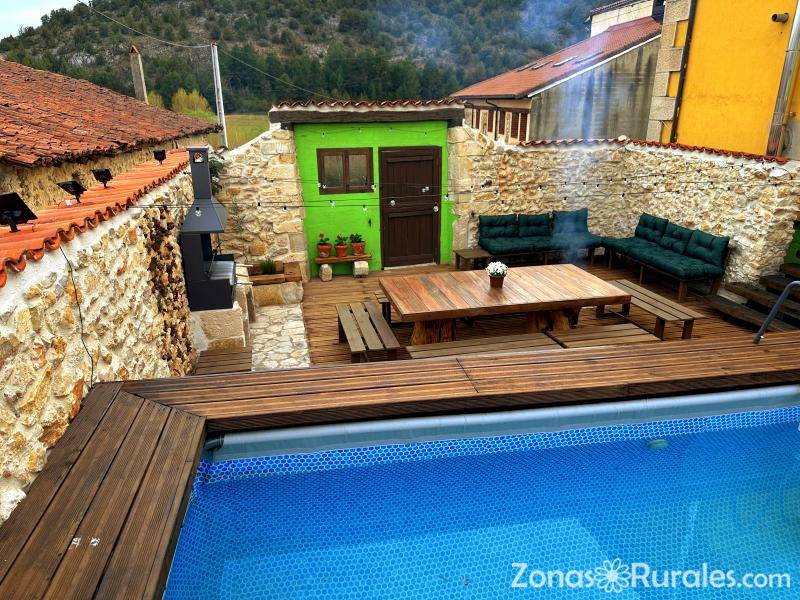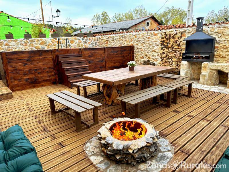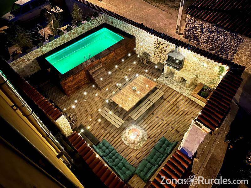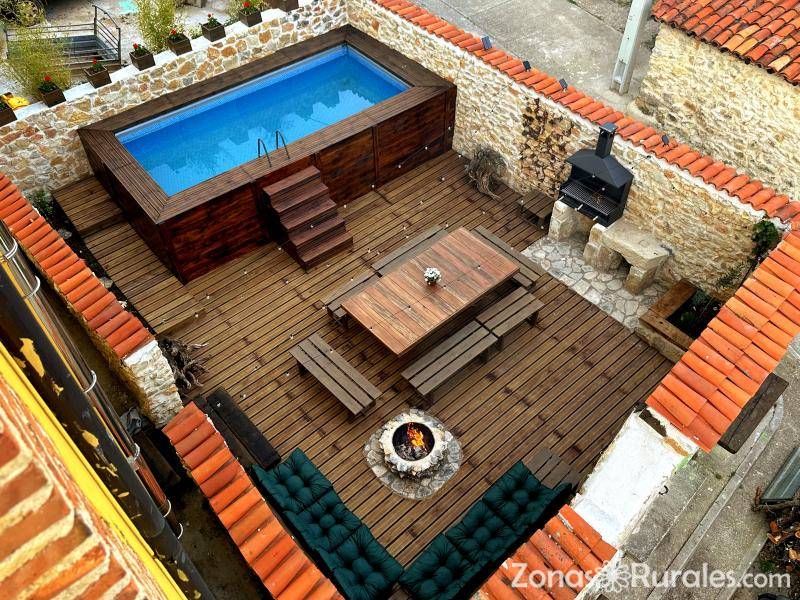 Tienes 400 metros cuadrados distribuidos en tres plantas y terraza ajardinada de madera y piedra con piscina, barbacoa, mesa para comer o cenar, zona chill out con brasero de piedra.